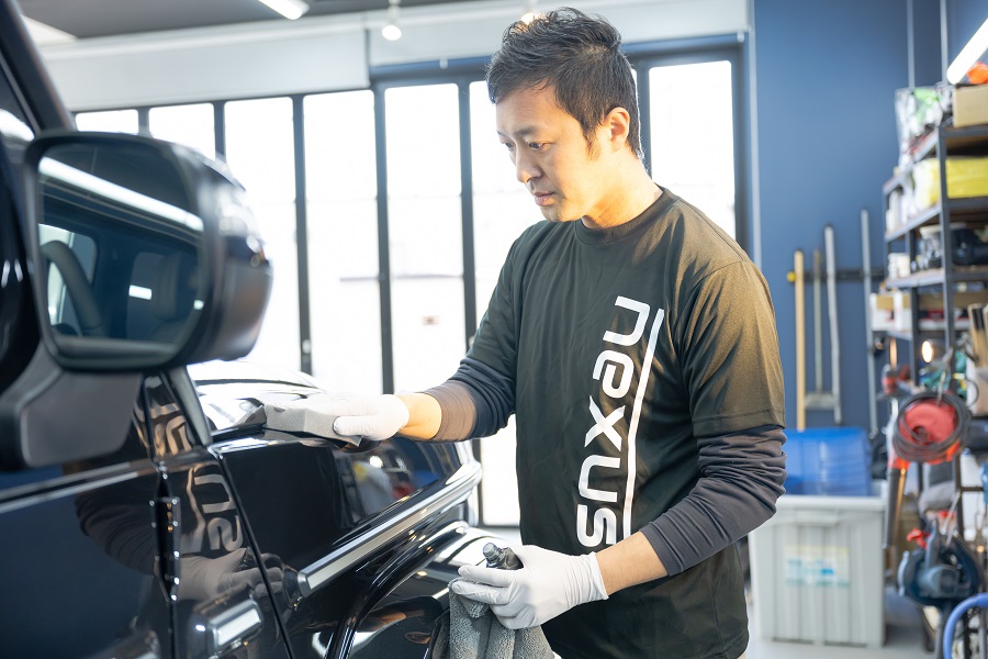 コーティング材の塗布作業において、作業空間の温度、湿度管理は非常にデリケートで重要です。 コーティング材は、温度が高いと塗布した直後から乾きはじめる為、ムラが出やすくなります。 ムラが出てしまうと均一な膜を形成することが出来ません。 湿度が高いと逆に乾きづらくなるため、初期硬化が遅れコーティング膜の実用強度が出るまでに時間がかかってしまいます。 nexusでは作業空間の温度、湿度を一年中一定に保つことが出来ます。