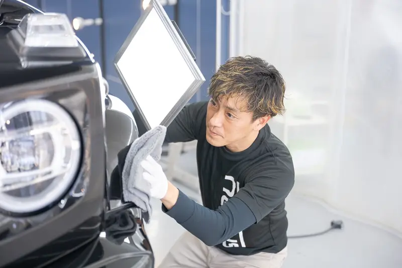 カーコーティングを施工する際には専用のクリーンブースで施します。 クリーンブースのような仕切られた空間でガラスコーティングを施工することでホコリやミスト,排気ガスなどの不純物を付着を防止します。 これによりコーティングの密着性を向上させ、コーティングの寿命や効果効能を向上させることが可能となります。 また、ブースに設置されている特殊な光源で塗装を厳重にチェックしながら作業を行います。